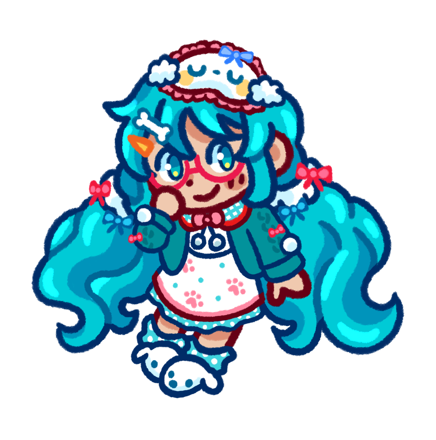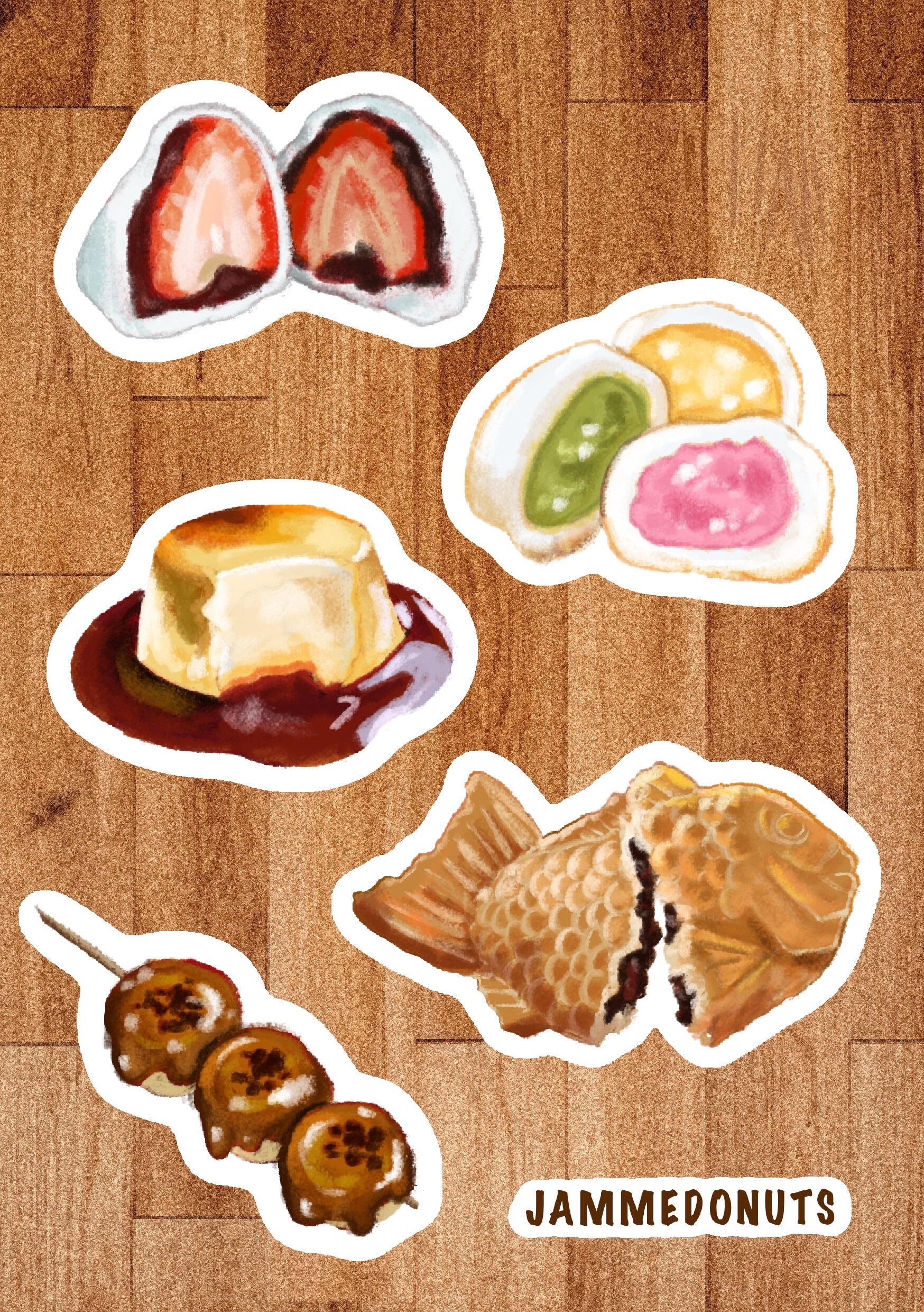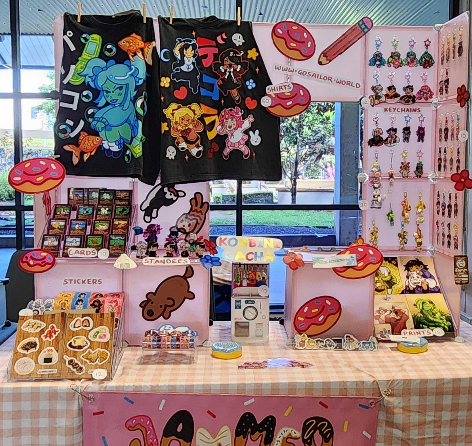 I sell fan merch and original designs at my stall set up under my business name 'Jammedonuts'. This includes blind bags, keychains, stickers, prints, and novelty dog cards. Currently I am also working on a project called Decora Girls - an independent shirt brand that focuses on quality and cool designs, including characters that feature in animated one-shots.